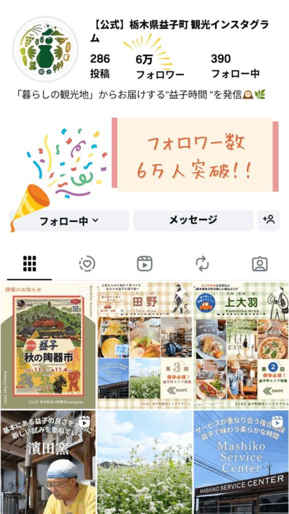 この度、ましこラボが運営する「【公式】栃木県益子町 観光インスタグラム(@mashiko.official)」のフォロワー数が6万人を突破しました。心より感謝の気持ちを込めてお知らせいたします。 皆様の温かいご支援とご愛 […]